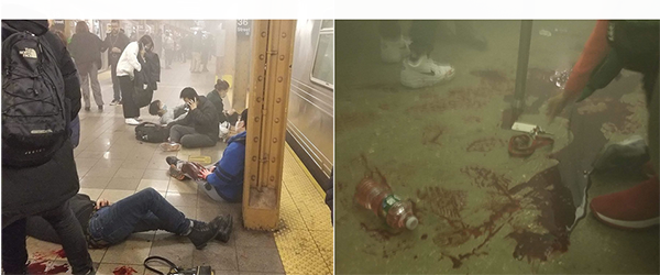 -- "At least 13 people were injured, including five believed to have been shot, in a gruesome attack in a Brooklyn subway station during Tuesday morning rush hour. The shooter was not in custody an hour and a half after he opened fire on the train as it approached the 36th Street and Fourth Avenue station in Sunset Park around 8:30 a.m.." --